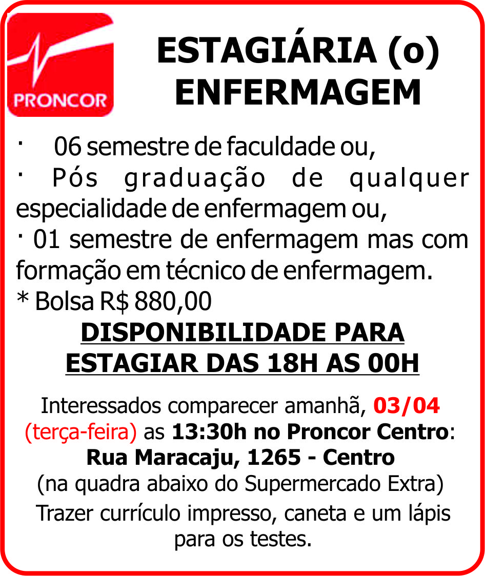 Interessados comparecer amanhã, 03/04 (terça-feira) as 13:30h no Proncor Centro: