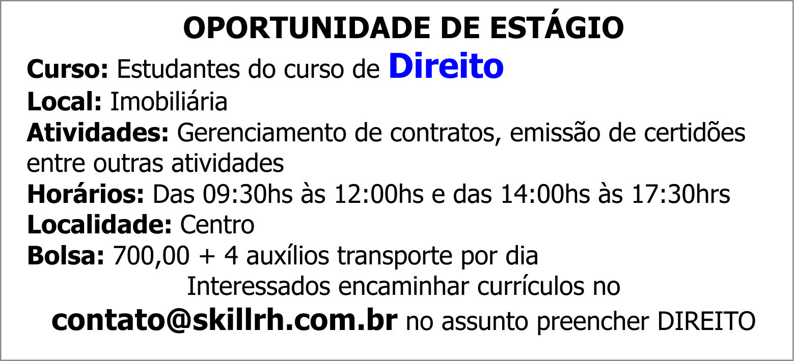 Interessados encaminhar currículos no [email protected] no assunto preencher DIREITO