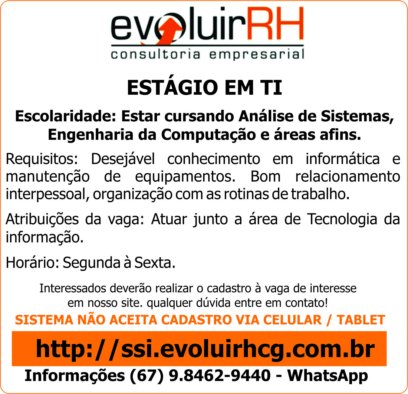 Interessados deverão realizar o cadastro à vaga de interesse em nosso site. qualquer dúvida entre em contato!