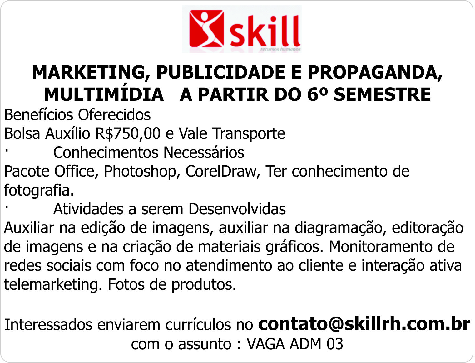 Interessados enviarem currículos no [email protected] com o assunto : VAGA ADM 03