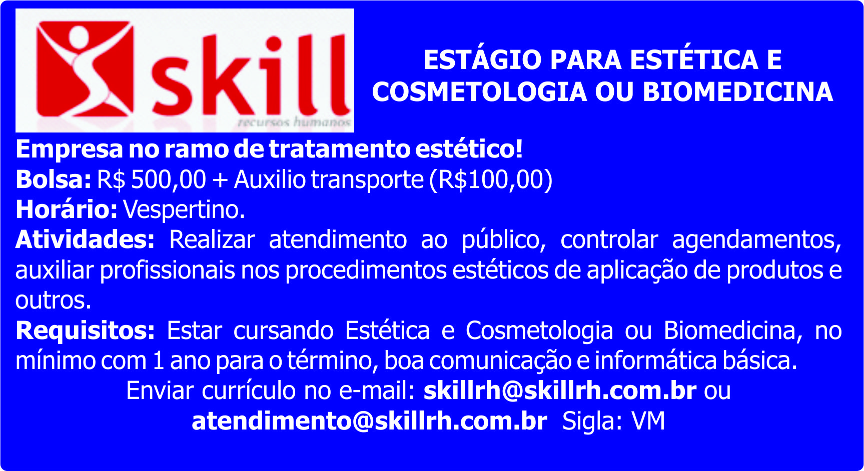 Requisitos: Estar cursando Estética e Cosmetologia ou Biomedicina, no mínimo com 1 ano para o término, boa comunicação e informática básica. Enviar currículo: