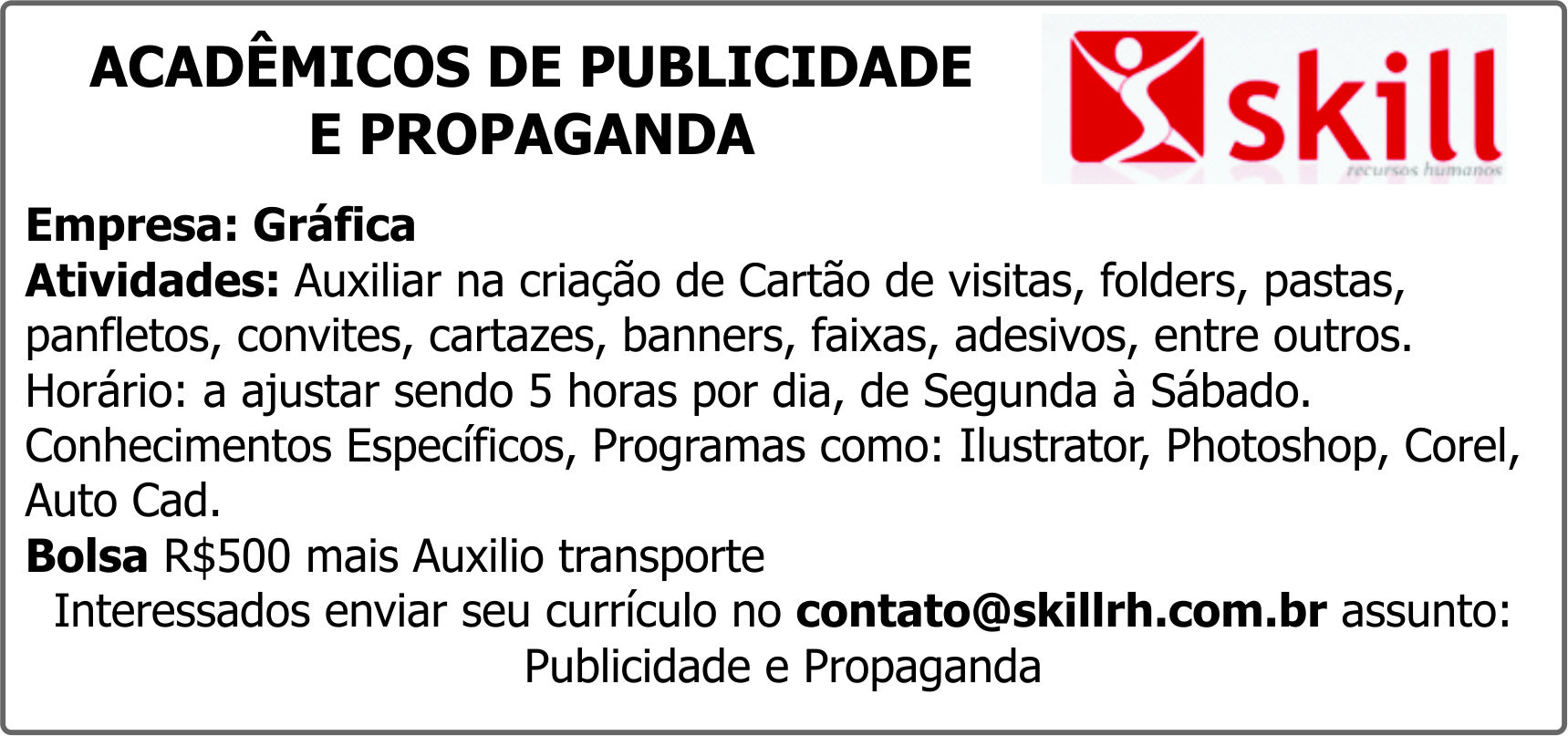 Interessados enviar seu currículo no [email protected] assunto: Publicidade e Propaganda