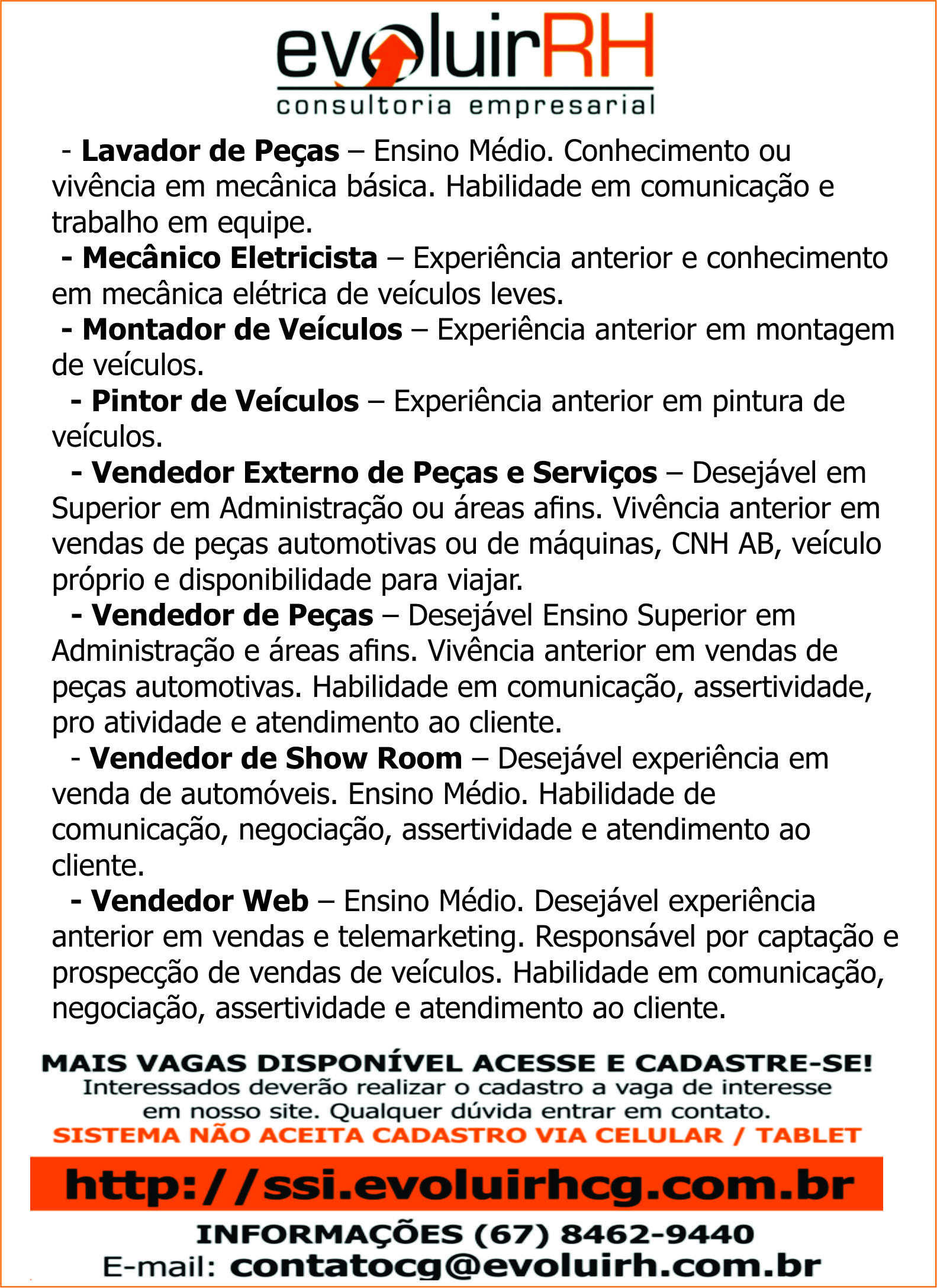 - Vendedor de Peças – Desejável Ensino Superior em Administração e áreas afins. Vivência anterior em vendas de peças automotivas. Habilidade em comunicação, assertividade, pro atividade e atendimento ao cliente.