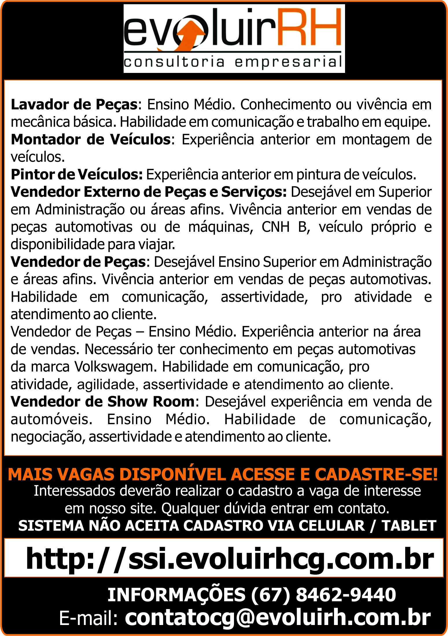 Evoluir Rh Seleciona: Lavador de Peças / Montador de Veículos / Pintor de Veículos / Vendedor Externo de Peças e Serviços / Vendedor de Peças / Vendedor de Show Room