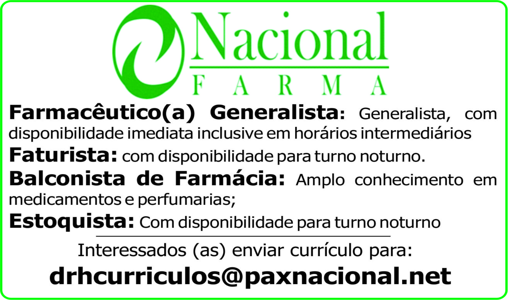 Farmacêutico (a) Generalista: Generalista, com disponibilidade imediata inclusive em horários intermediários.