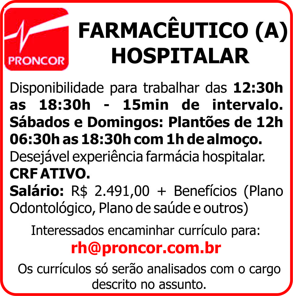 Desejável experiência farmácia hospitalar.
