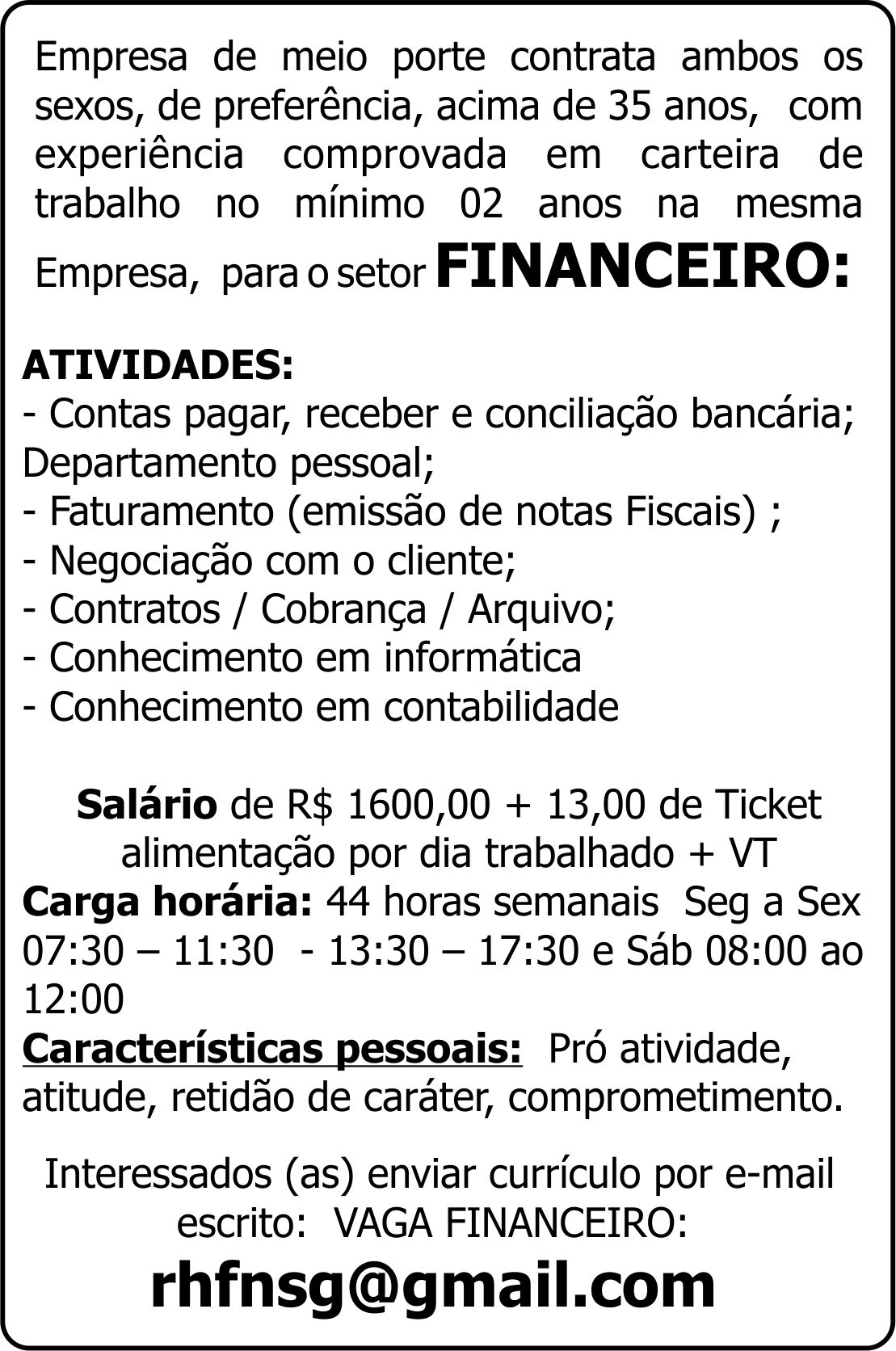 Empresa de meio porte contrata ambos os sexos, de preferência, acima de 35 anos, com experiência comprovada em carteira de trabalho no mínimo 02 anos na mesma Empresa, para o setor FINANCEIRO:
