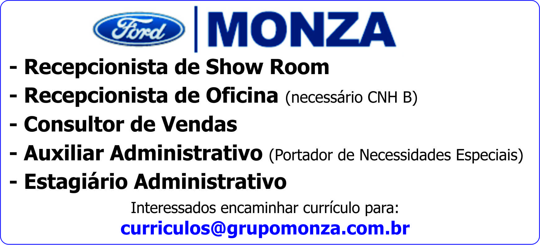 Ford Monza - Recepcionista de Show Room / Recepcionista de Oficina (necessário CNH B) / Consultor de Vendas / Auxiliar Administrativo (Portador de Necessidades Especiais) / Estagiário Administrativo