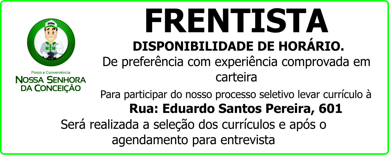 Para participar do nosso processo seletivo levar currículo à Rua: Eduardo Santos Pereira, 601