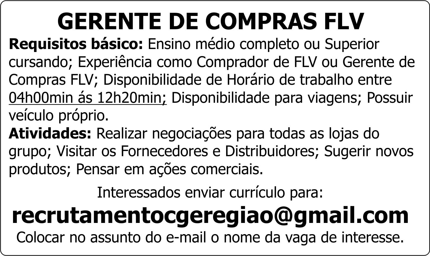 Requisitos básico: Ensino médio completo ou Superior cursando; Experiência como Comprador de FLV ou Gerente de Compras FLV; Disponibilidade de Horário de trabalho entre 04h00min ás 12h20min; Disponibilidade para viagens; Possuir veículo próprio.