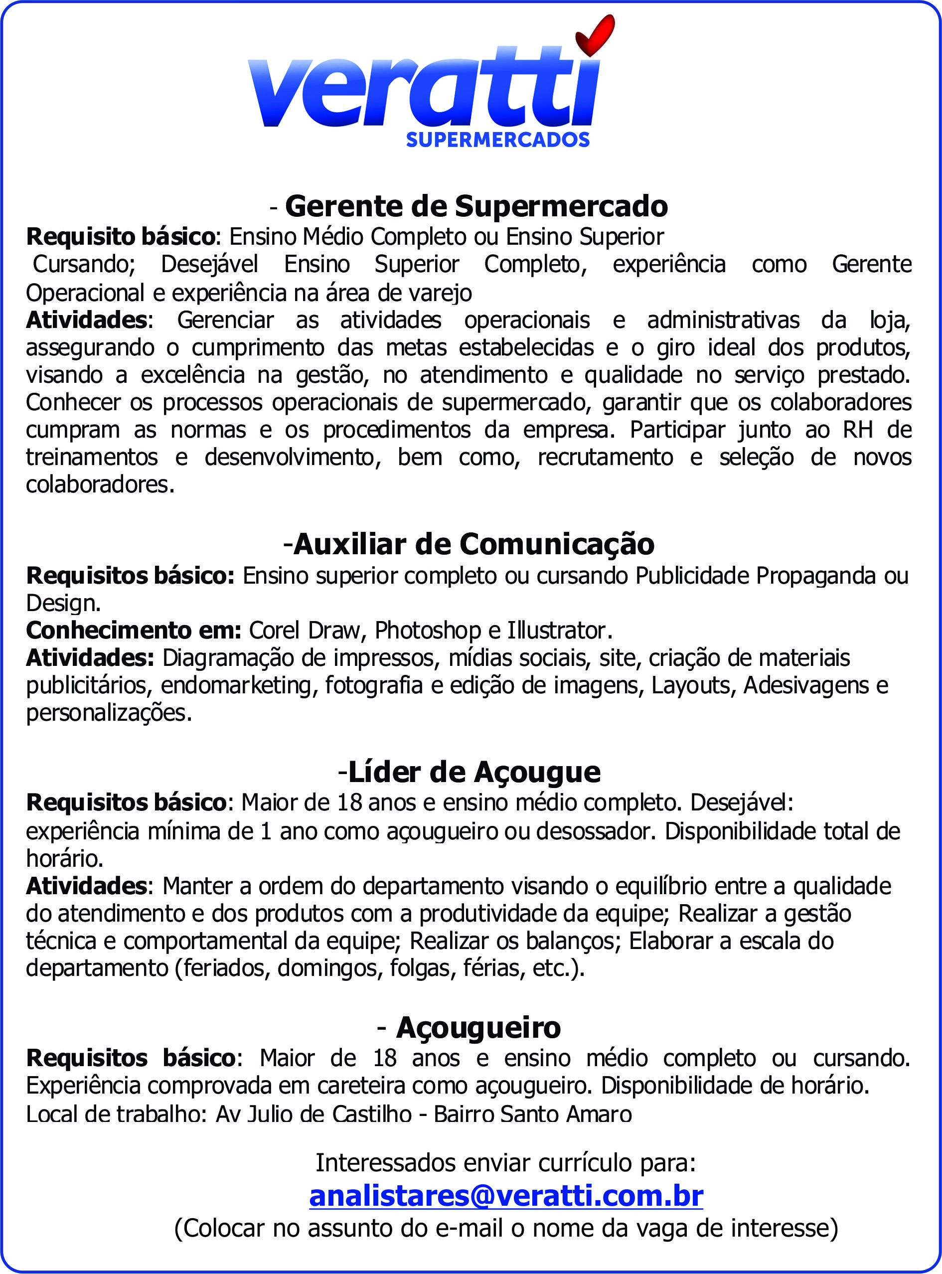 Atividades: Gerenciar as atividades operacionais e administrativas da loja, assegurando o cumprimento das metas estabelecidas e o giro ideal dos produtos, visando a excelência na gestão, no atendimento e qualidade no serviço prestado. Conhecer os processos operacionais de supermercado, garantir que os colaboradores cumpram as normas e os procedimentos da empresa. Participar junto ao RH de treinamentos e desenvolvimento, bem como, recrutamento e seleção de novos colaboradores.