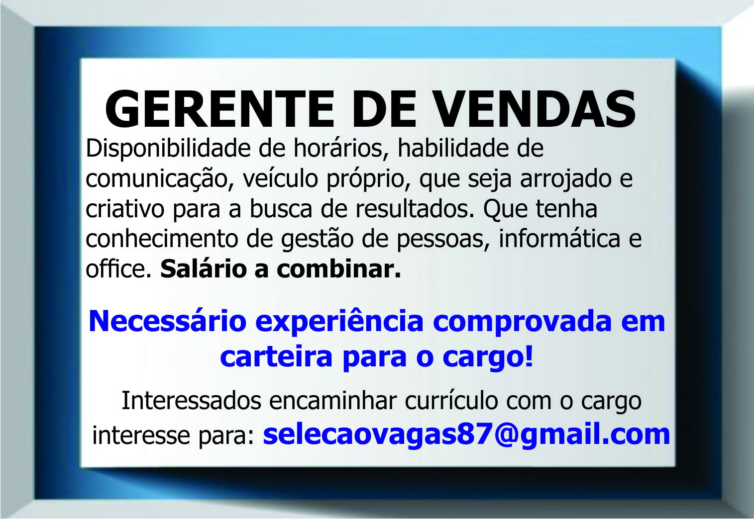 Disponibilidade de horários, habilidade de comunicação, veículo próprio, que seja arrojado e criativo para a busca de resultados. Que tenha conhecimento de gestão de pessoas, informática e office. Salário a combinar. Enviar currículo: