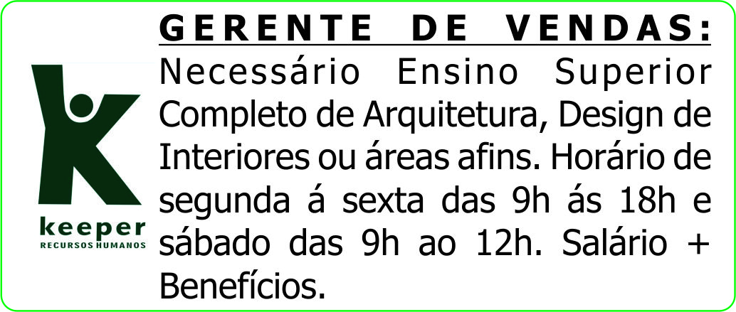 Necessário Ensino Superior Completo de Arquitetura, Design de Interiores ou áreas afins. Horário de segunda á sexta das 9h ás 18h e sábado das 9h ao 12h. Salário + Benefícios.