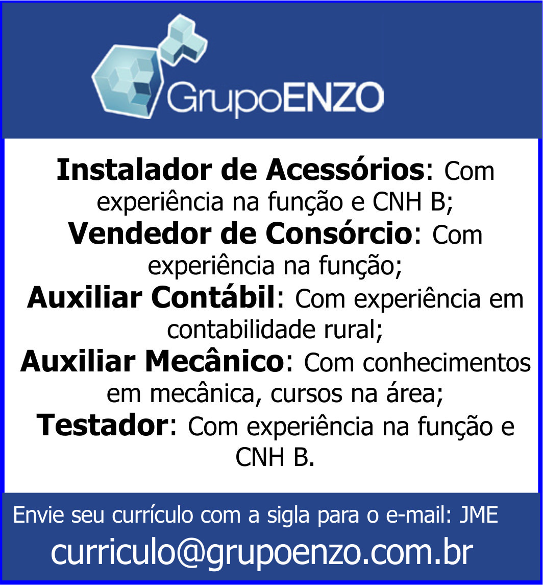 Grupo Enzo - Auxiliar de Mecânico / Instalador de Acessórios / Auxiliar Contábil / Testador / Vendedor de Consórcio