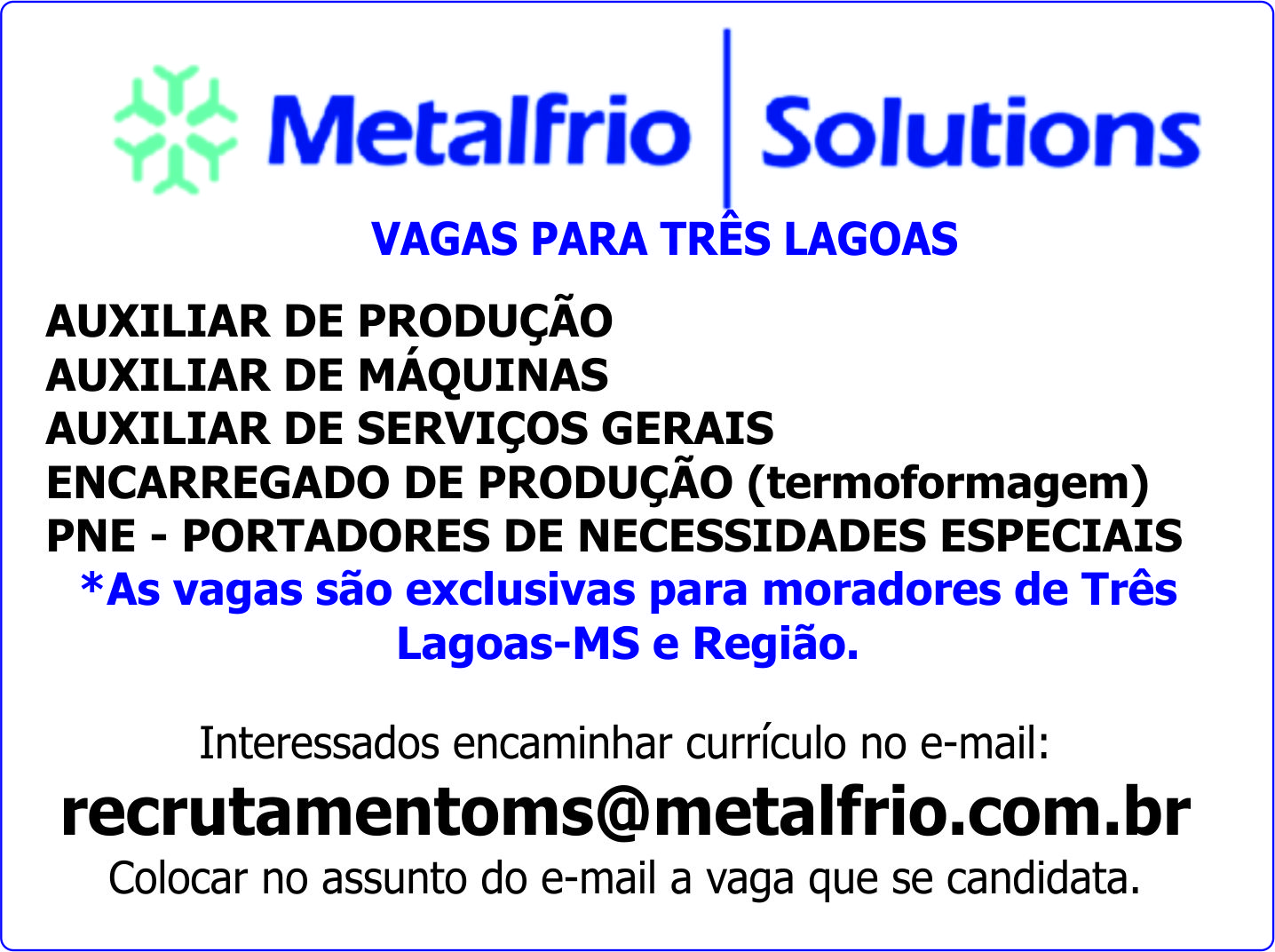 *As vagas são exclusivas para moradores de Três Lagoas-MS e Região. Enviar currículo: