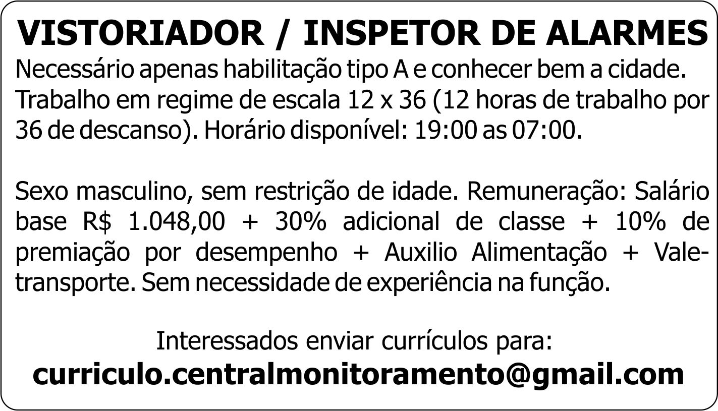 Trabalho em regime de escala 12 x 36 (12 horas de trabalho por 36 de descanso). Horário disponível: 19:00 as 07:00.