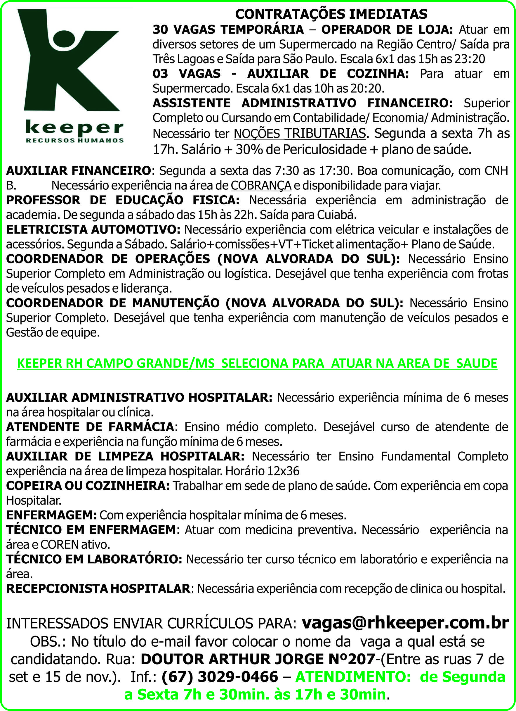 * Importante: Algumas vagas já estão em processo seletivo. Caso tenha interesse em alguma oportunidade, por favor, entrar em contato para confirmação da vaga disponíveis e encaminhar currículo para o e-mail informado com a vaga de interesse no assunto.