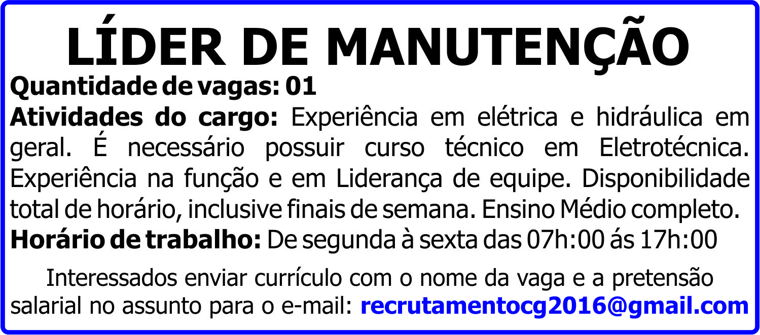 Atividades do cargo: Experiência em elétrica e hidráulica em geral. É necessário possuir curso técnico em Eletrotécnica. Experiência na função e em Liderança de equipe. Disponibilidade total de horário, inclusive finais de semana. Ensino Médio completo.