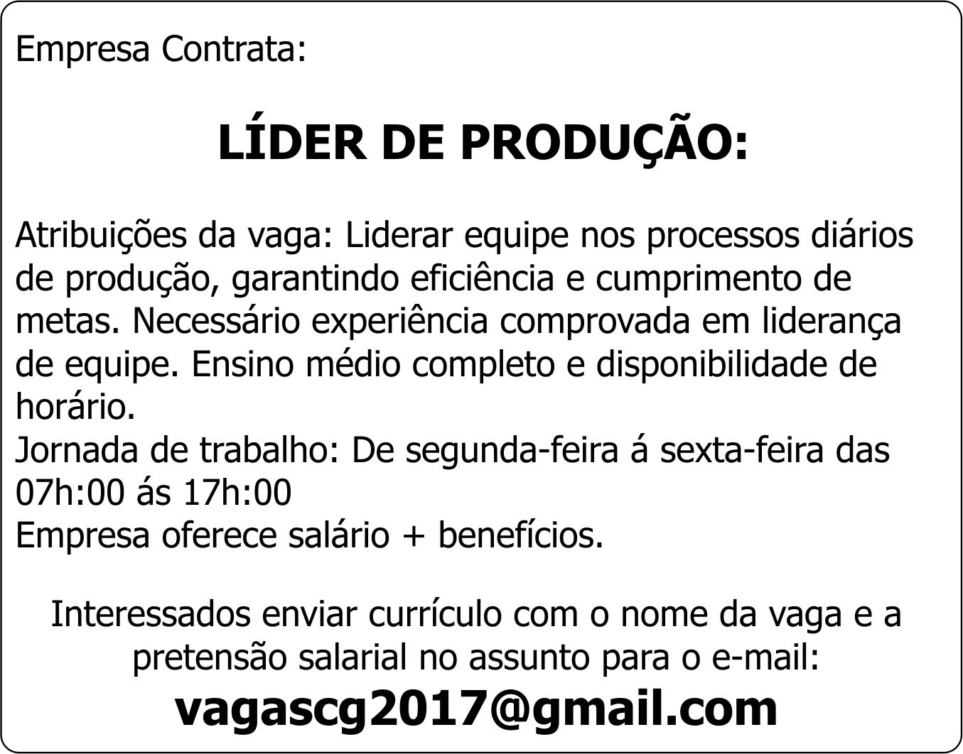 Atribuições da vaga: Liderar equipe nos processos diários de produção, garantindo eficiência e cumprimento de metas. Necessário experiência comprovada em liderança de equipe. Ensino médio completo e disponibilidade de horário.
