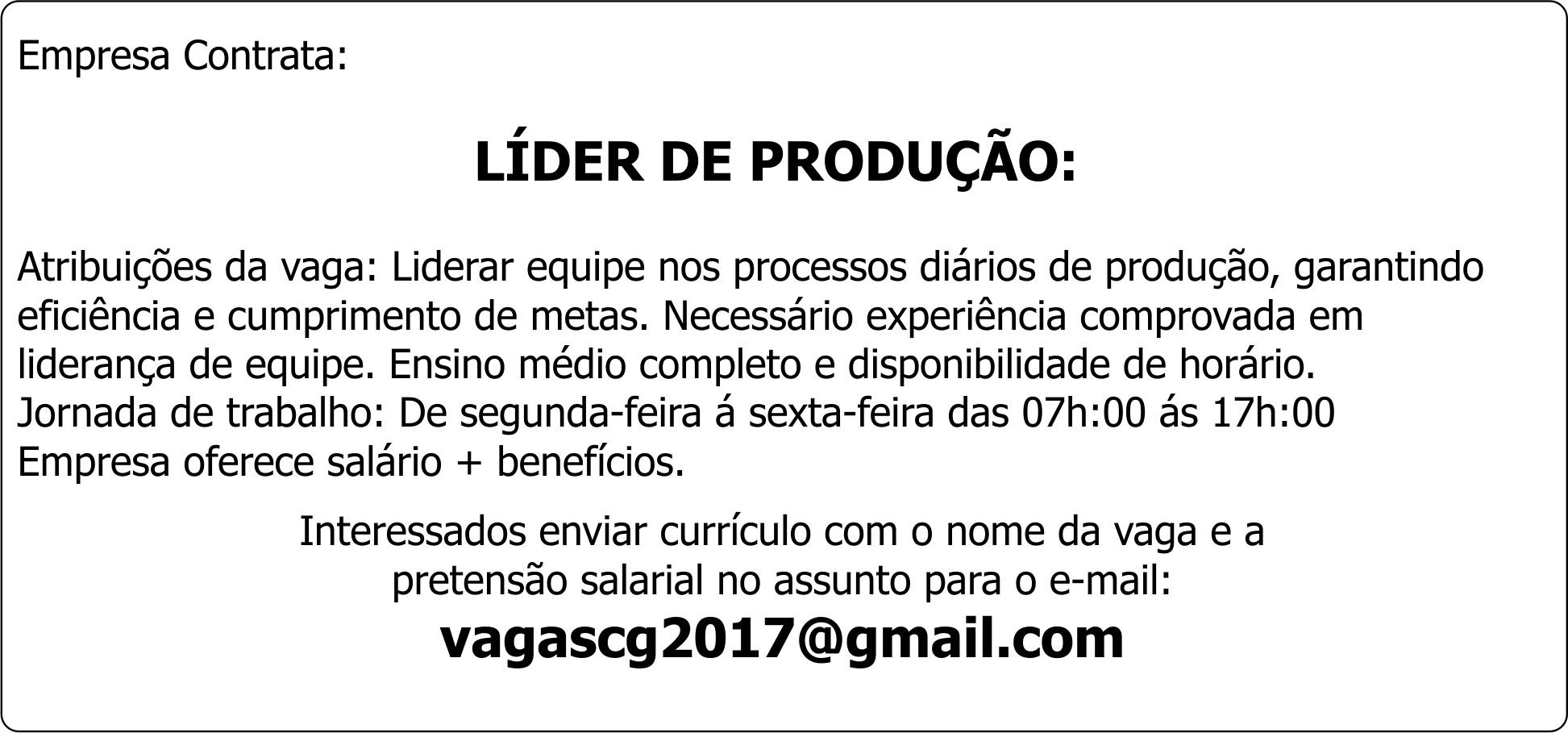 Atribuições da vaga: Liderar equipe nos processos diários de produção, garantindo eficiência e cumprimento de metas. Necessário experiência comprovada em liderança de equipe. Ensino médio completo e disponibilidade de horário.