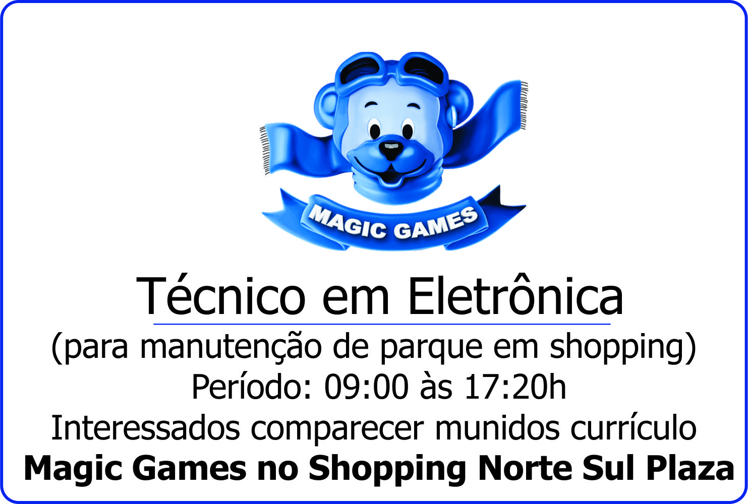 Técnico em Eletrônica (para manutenção de parque em shopping) Período: 09:00 às 17:20h Interessados comparecer munidos currículo Magic Games no Shopping Norte Sul Plaza