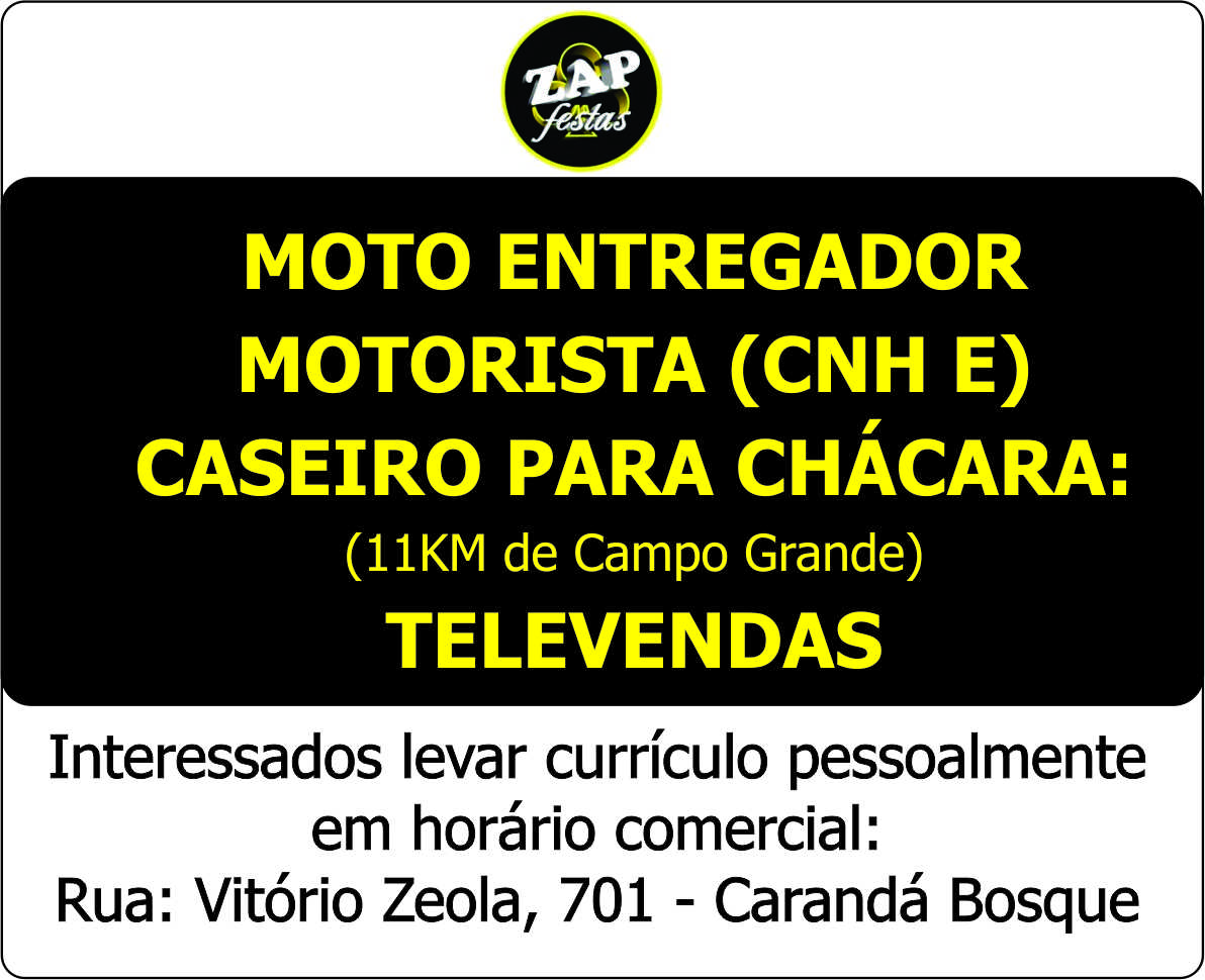 Moto Entregador / Motorista - Categoria E / Caseiro para Chácara e Televendas: Interessados comparecer Rua Vitório Zeola, 701 - Carandá Bosque.