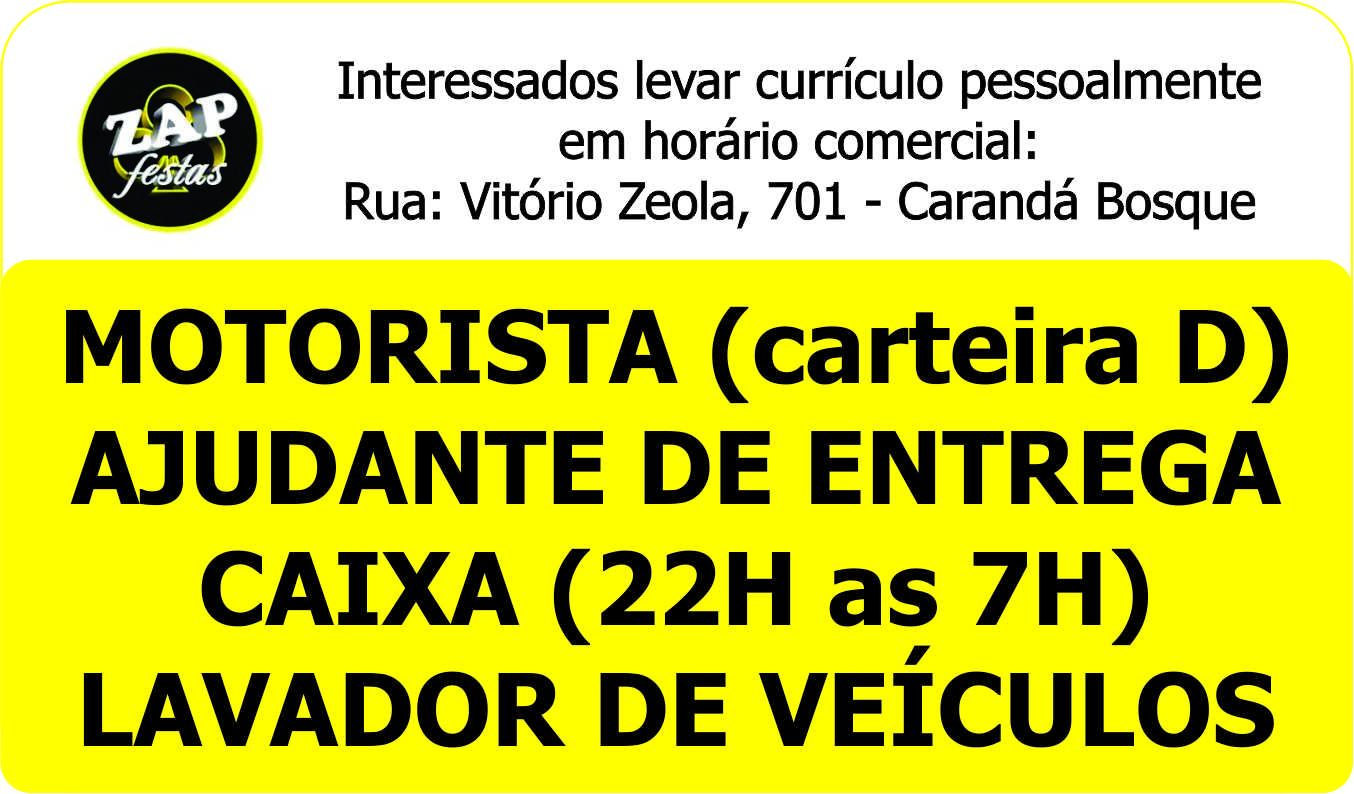 MOTORISTA (carteira D) / AJUDANTE DE ENTREGA / CAIXA (22H as 7H) / LAVADOR DE VEÍCULOS