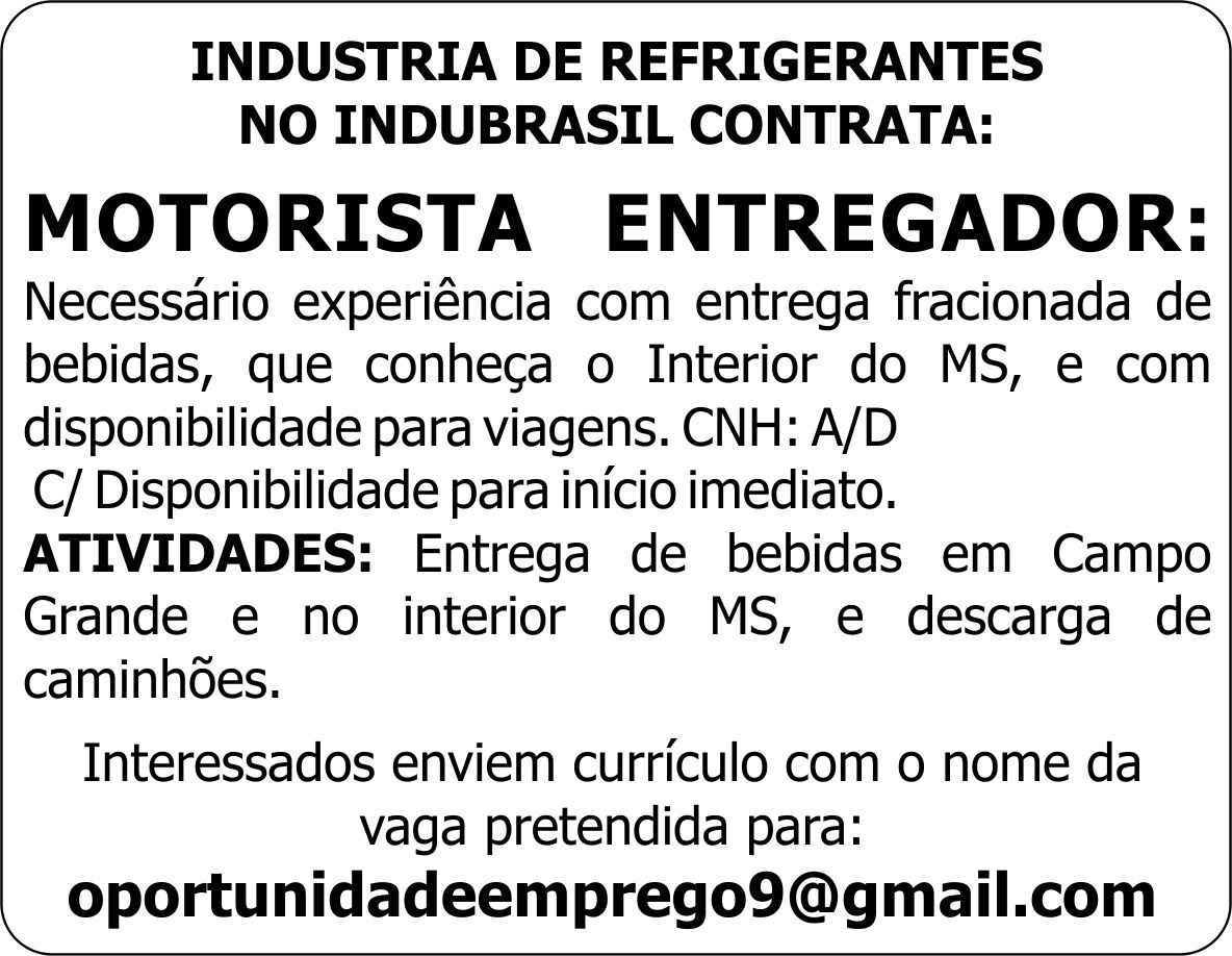 Necessário experiência com entrega fracionada de bebidas, que conheça o Interior do MS, e com disponibilidade para viagens. CNH: A/D