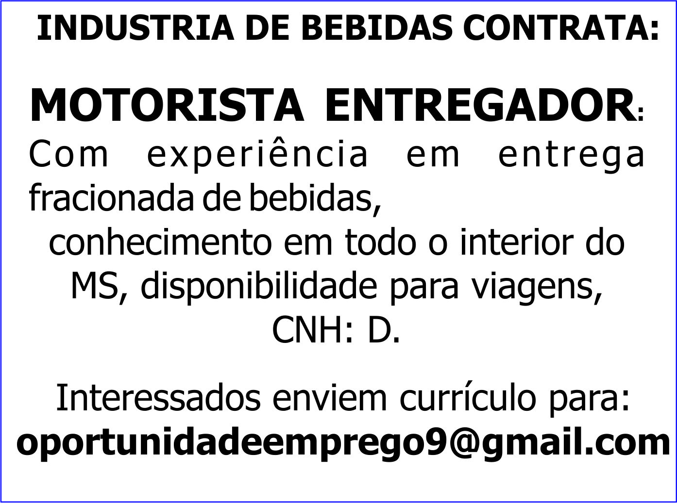 Com experiência em entrega fracionada de bebidas, conhecimento em todo o interior do MS, disponibilidade para viagens, CNH: D.