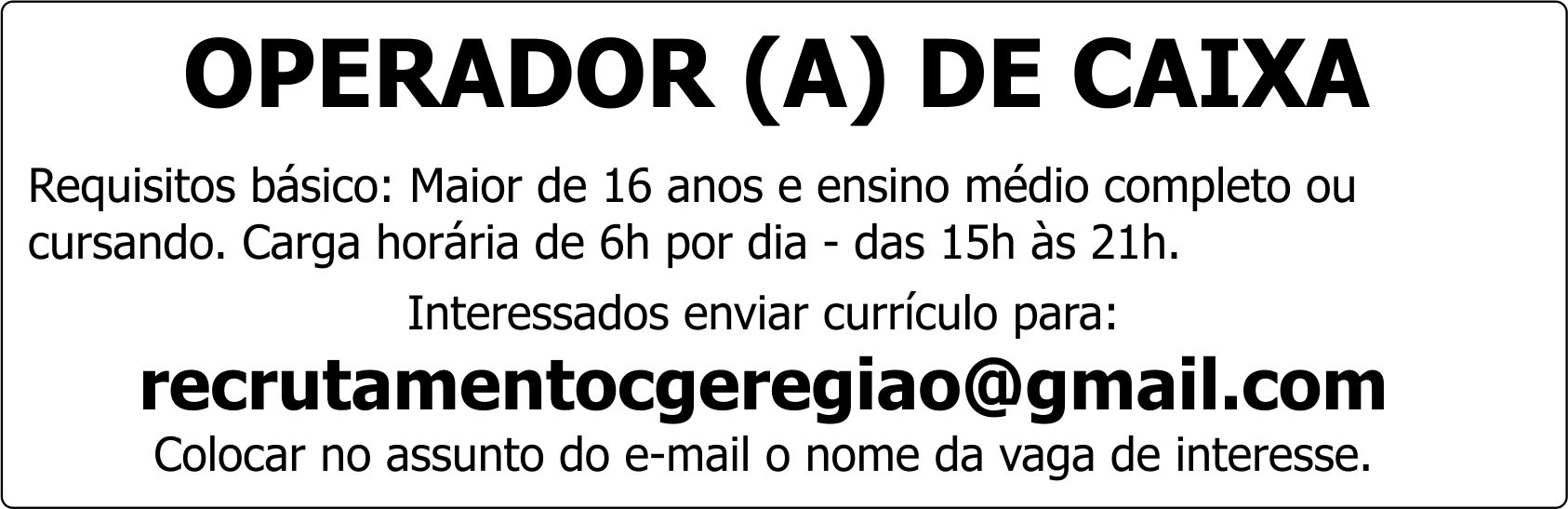 Requisitos básico: Maior de 16 anos e ensino médio completo ou cursando. Carga horária de 6h por dia - das 15h às 21h.