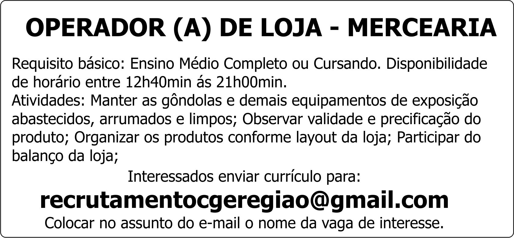 Atividades: Manter as gôndolas e demais equipamentos de exposição abastecidos, arrumados e limpos; Observar validade e precificação do produto; Organizar os produtos conforme layout da loja; Participar do balanço da loja;