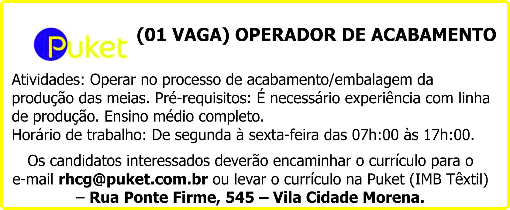 e-mail [email protected] ou levar o currículo na Puket (IMB Têxtil) – Rua Ponte Firme, 545 – Vila Cidade Morena.