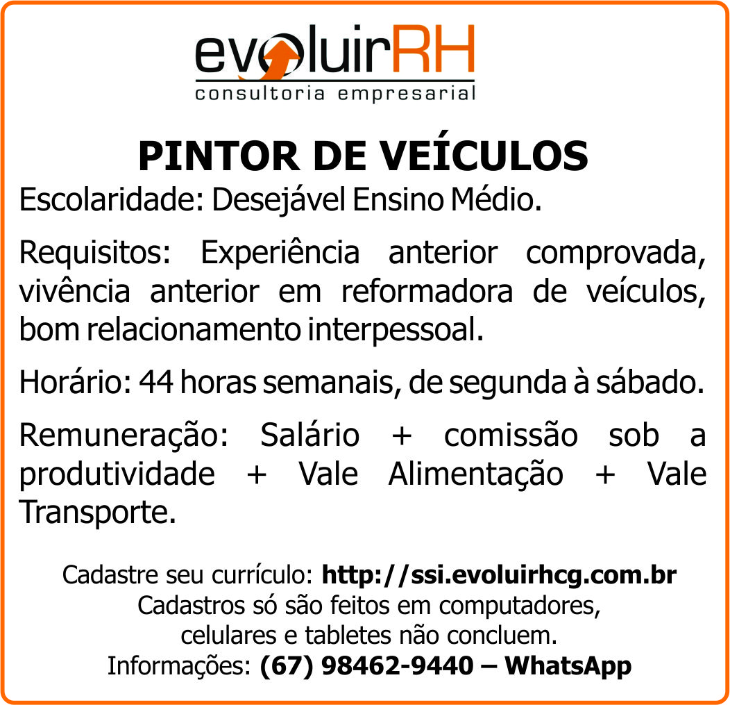Requisitos: Experiência anterior comprovada, vivência anterior em reformadora de veículos, bom relacionamento interpessoal.
