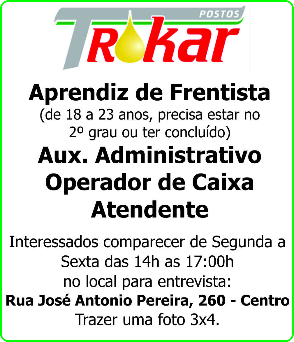 Posto Trokar - Aprendiz de Frentista / Auxiliar Administrativo / Operador de Caixa / Atendente