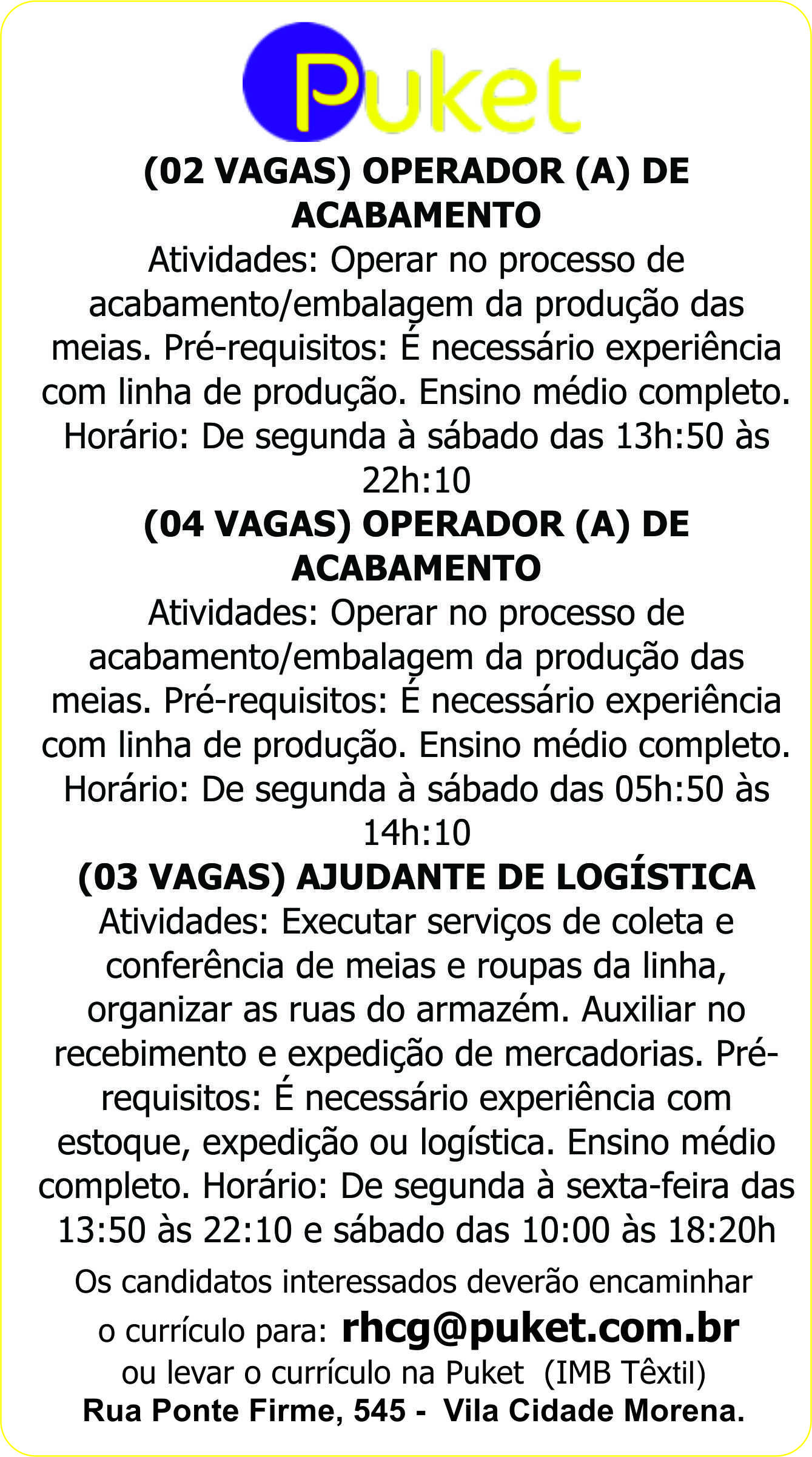 Puket - Operador (A) de Acabamento / Ajudante de Logística