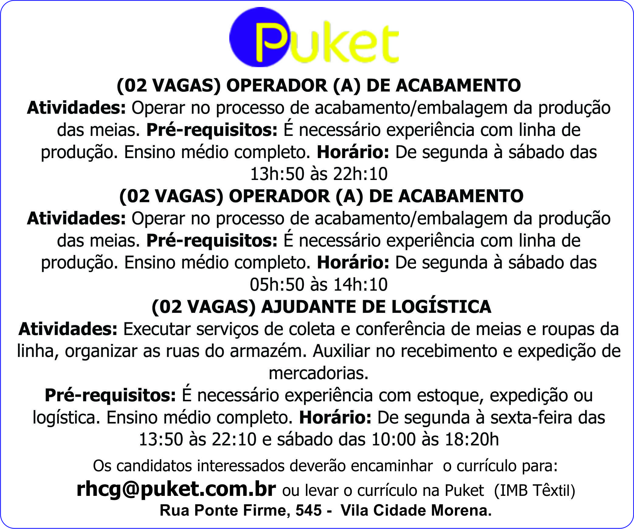 Puket - Operador (A) de Acabamento / Ajudante de Logística