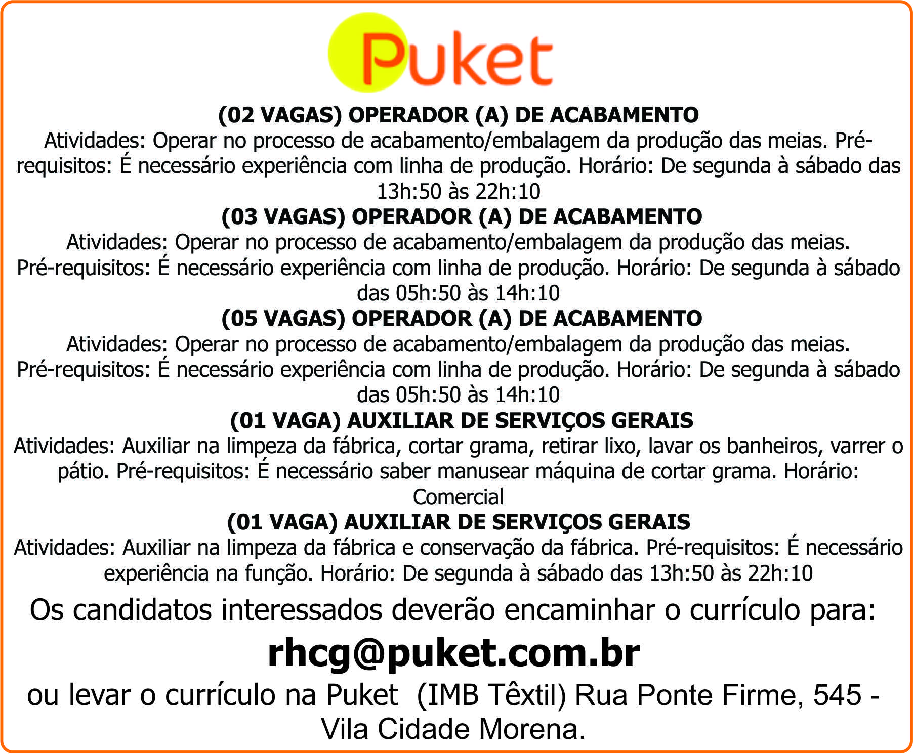 Puket - Operador (A) de Acabamento / Auxiliar de Serviços Gerais