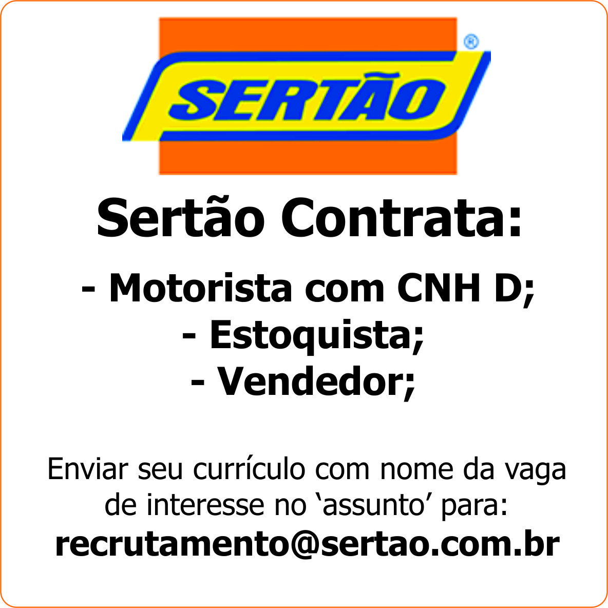 Sertão Contrata: - Motorista com CNH D; - Estoquista; - Vendedor; Enviar seu currículo com nome da vaga de interesse no ‘assunto’ para: [email protected]