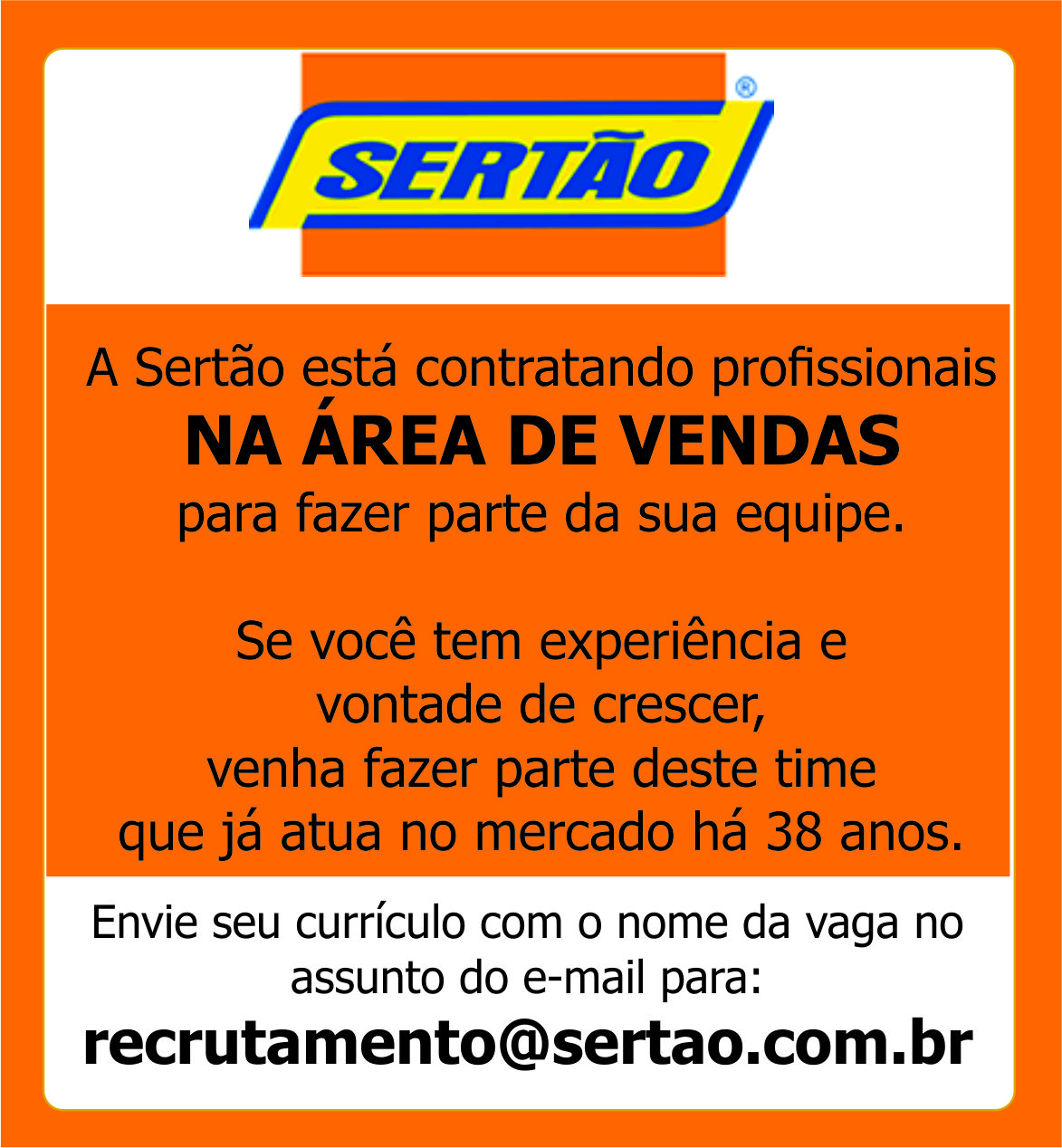 SERTÃO CONTRATA PROFISSIONAIS PARA ÁREA DE VENDAS: