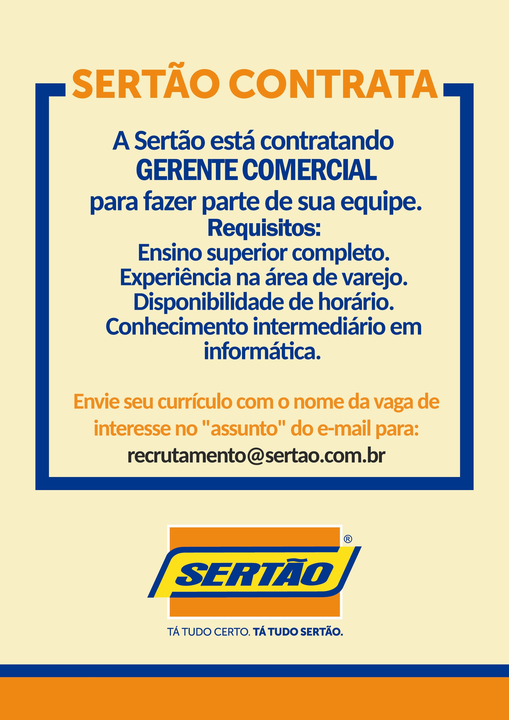 Sertão está contratando GERENTE COMERCIAL