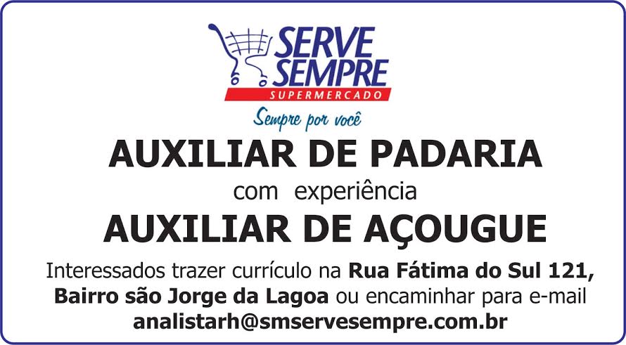 Serve Sempre Supermercado - AUXILIAR DE PADARIA com experiência AUXILIAR DE AÇOUGUE Interessados trazer currículo na Rua Fátima do Sul 121, Bairro são Jorge da Lagoa ou encaminhar para e-mail [email protected]