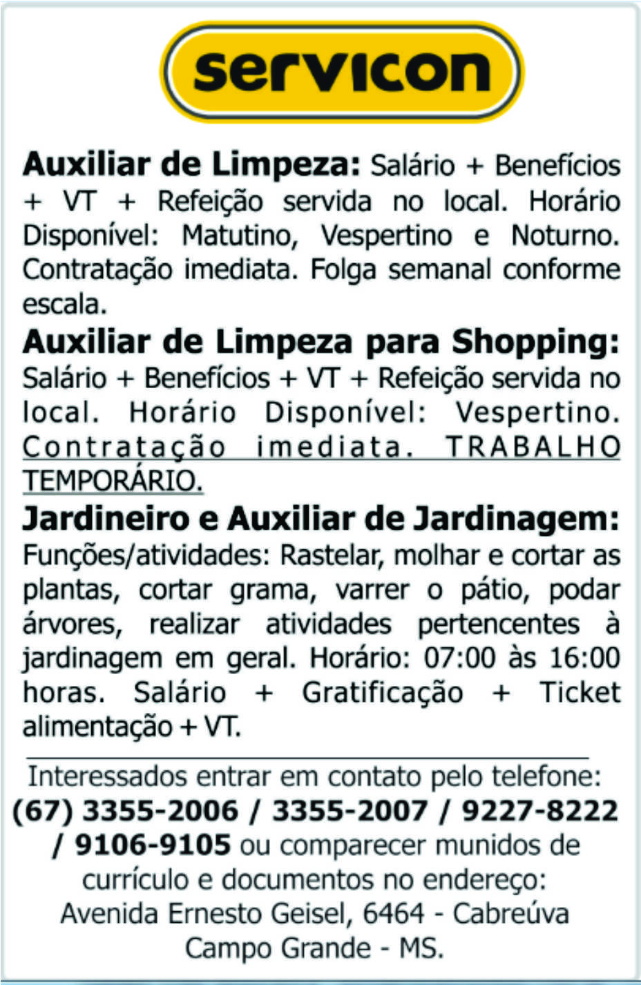 Servicon - Auxiliar de Limpeza / Jardineiro / Auxiliar de Jardinagem