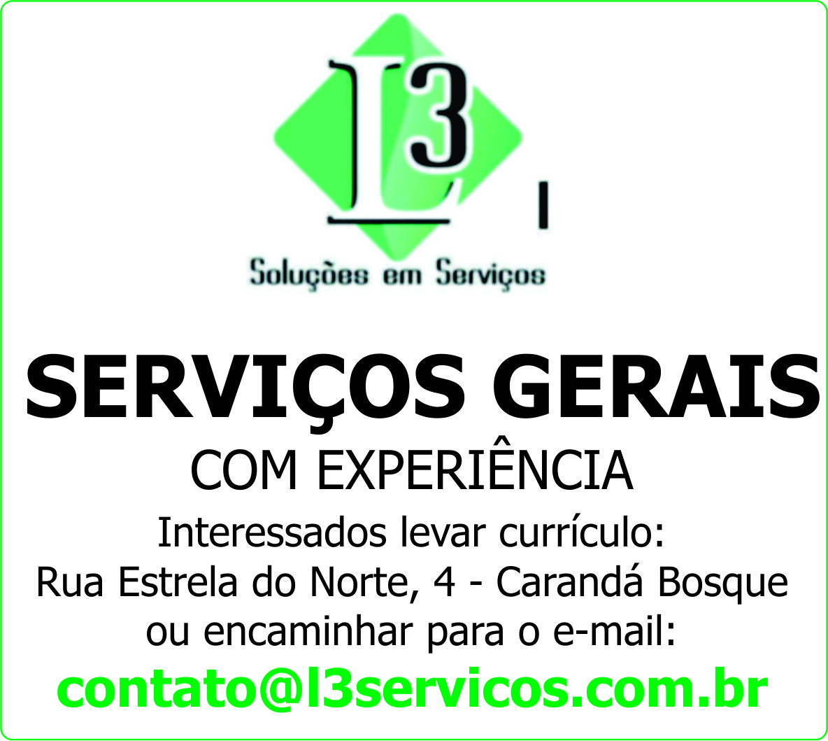 Interessados levar currículo: Rua Estrela do Norte, 4 - Carandá Bosque