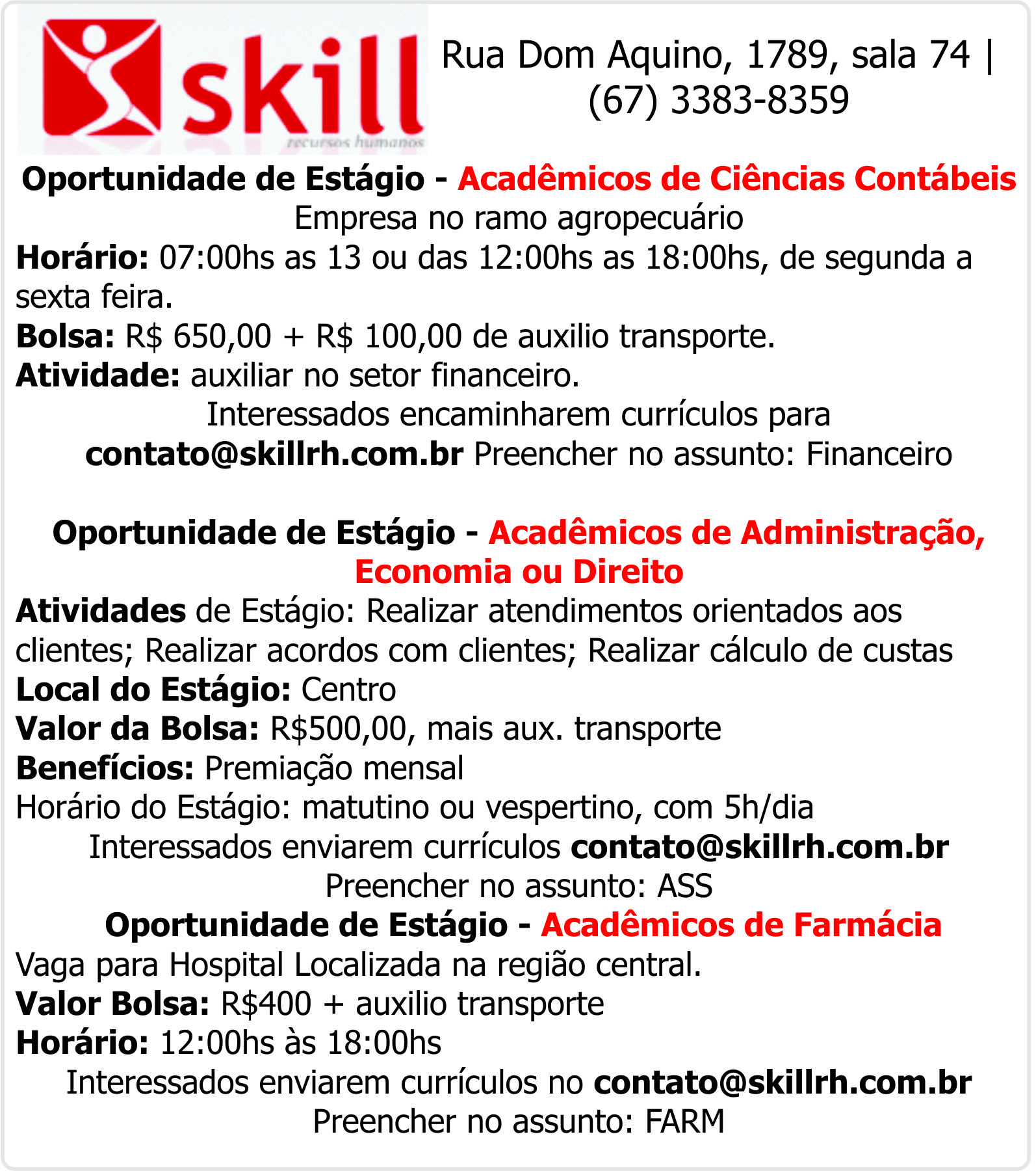 Skill Rh - Vaga de estagio em Direito/Administração/Economia / Ciências Contábeis / Farmácia
