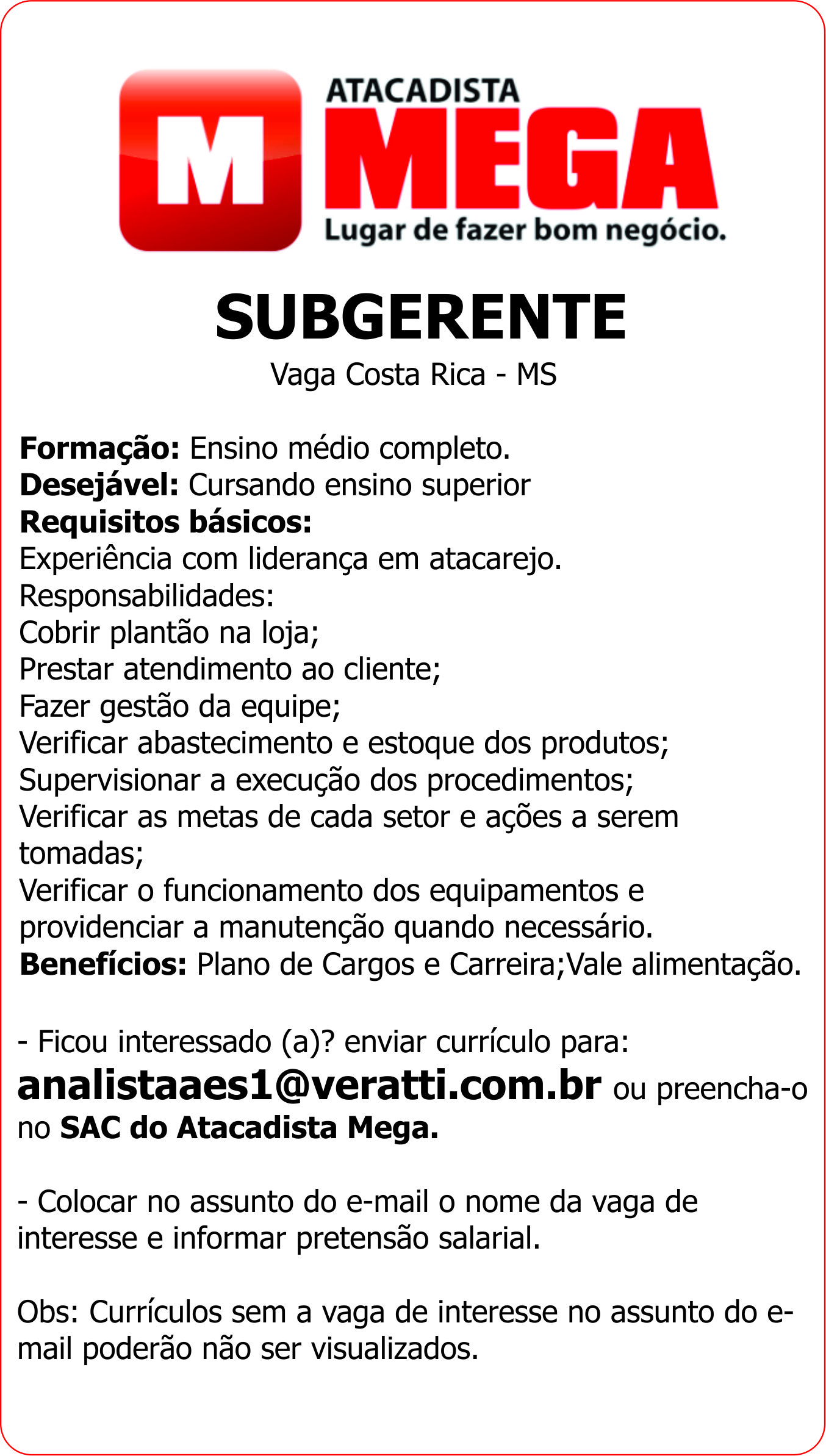 Benefícios: Plano de Cargos e Carreira; Vale alimentação.- Ficou interessado (a)? enviar currículo para: [email protected] ou preencha-o no SAC do Atacadista Mega.