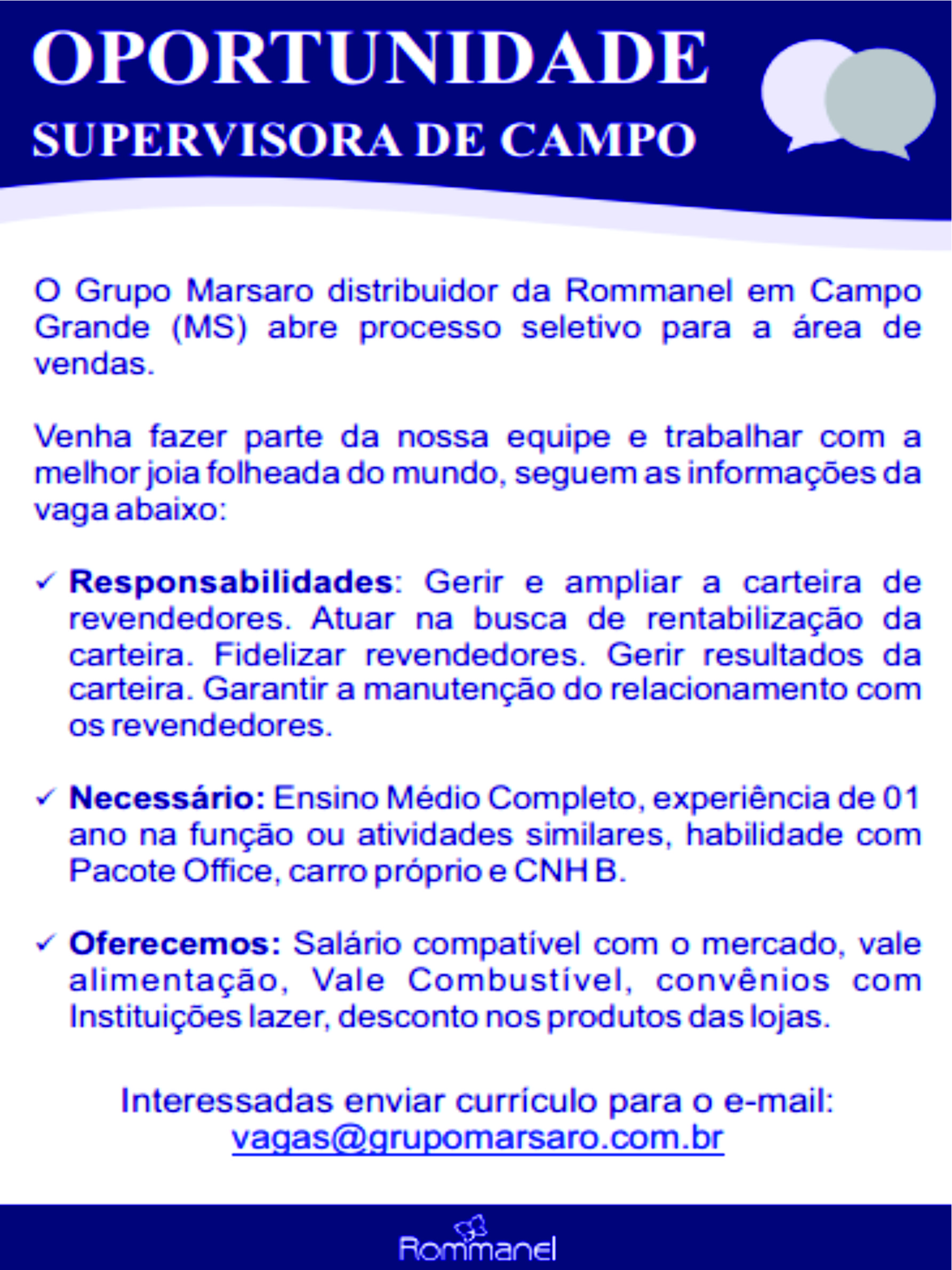 O Grupo Marsaro distribuidor da Rommanel em Campo Grande (MS) abre processo seletivo para a área de vendas.