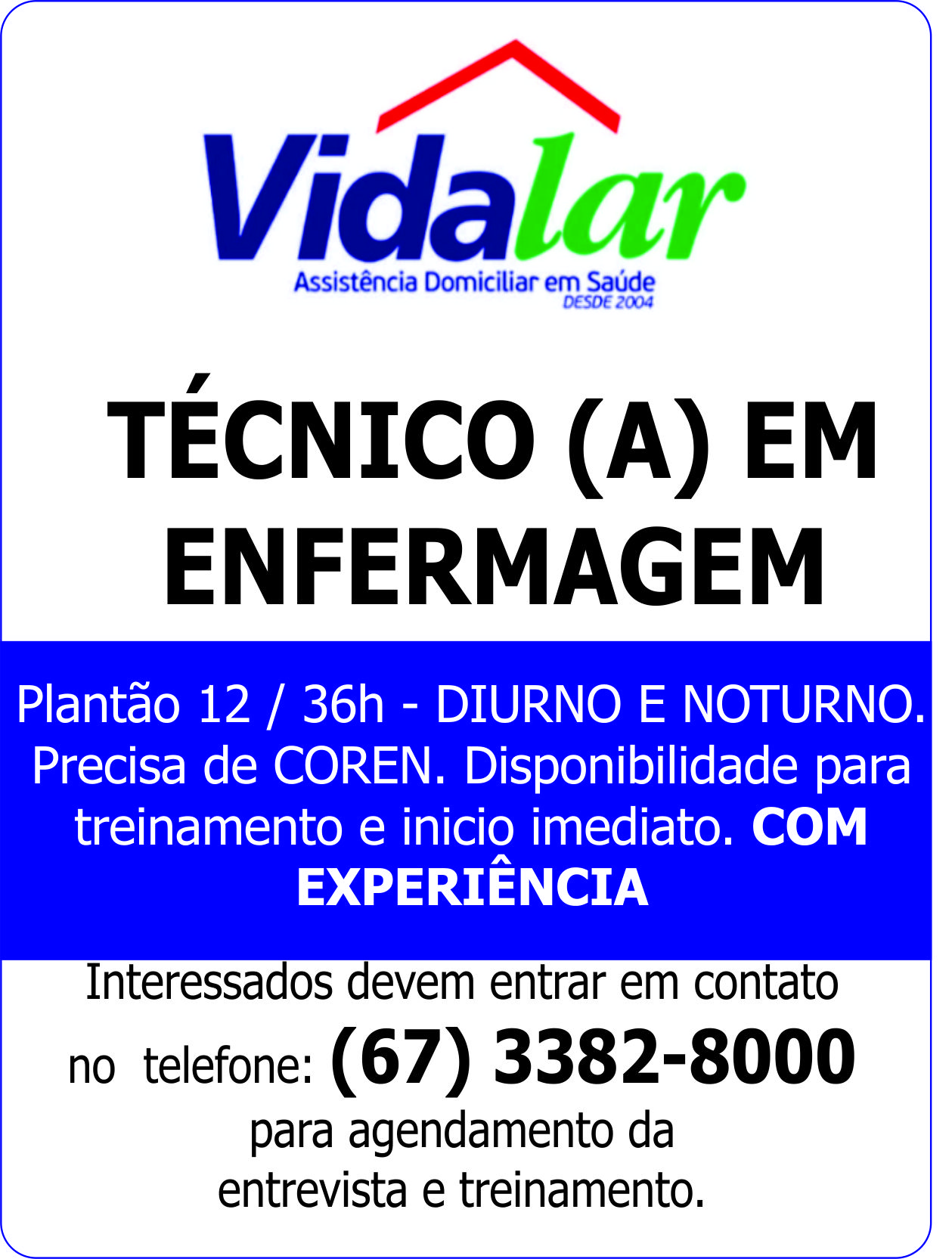 Precisa de COREN. Disponibilidade para treinamento e inicio imediato. COM EXPERIÊNCIA