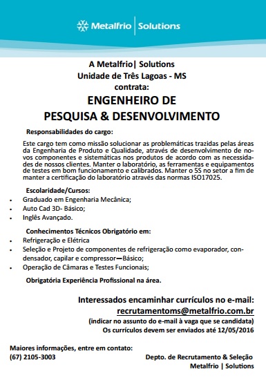 Três Lagoas - Engenheiro de Pesquisa e Desenvolvimento