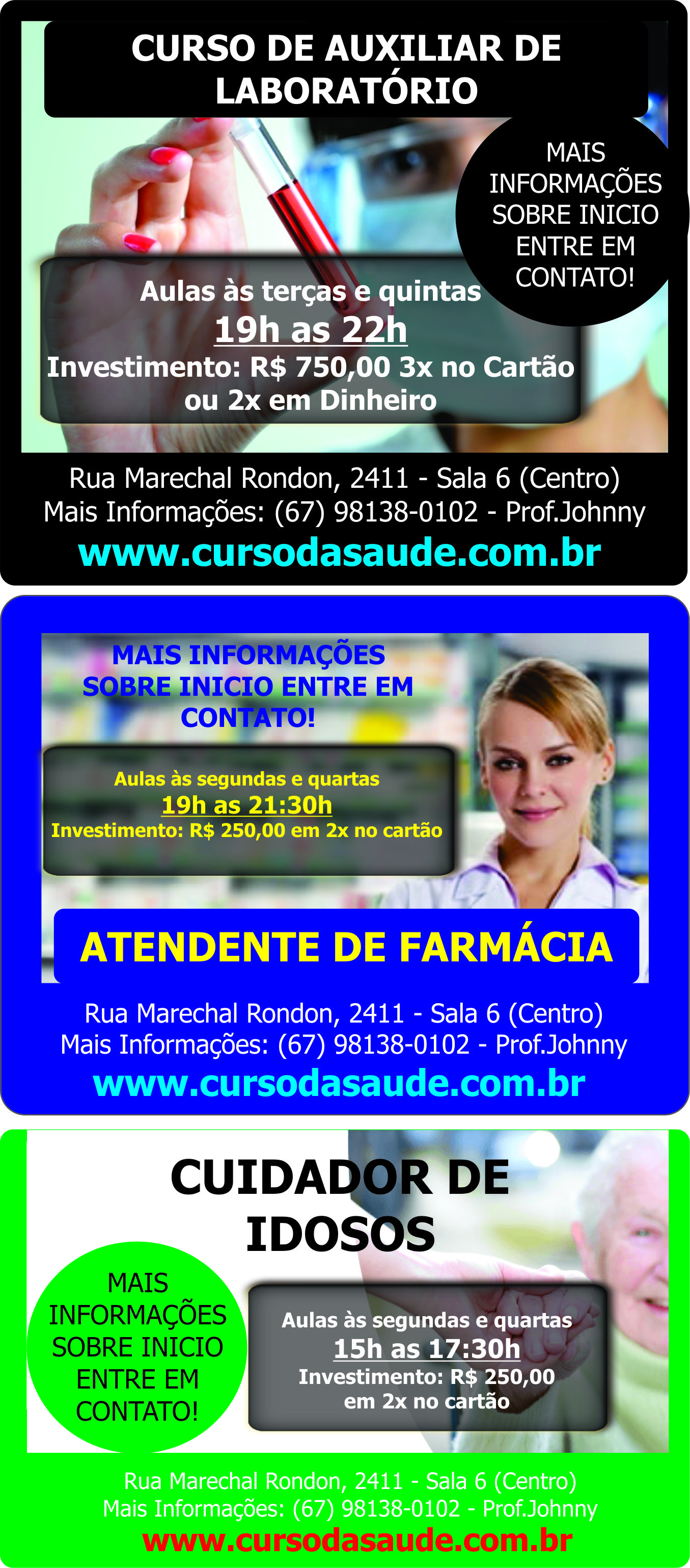 ÚLTIMAS VAGAS PARA 2016 NOS CURSOS: ATENDENTE DE FARMÁCIA / CUIDADOR DE IDOSO E AUXILIAR DE LABORATÓRIO: