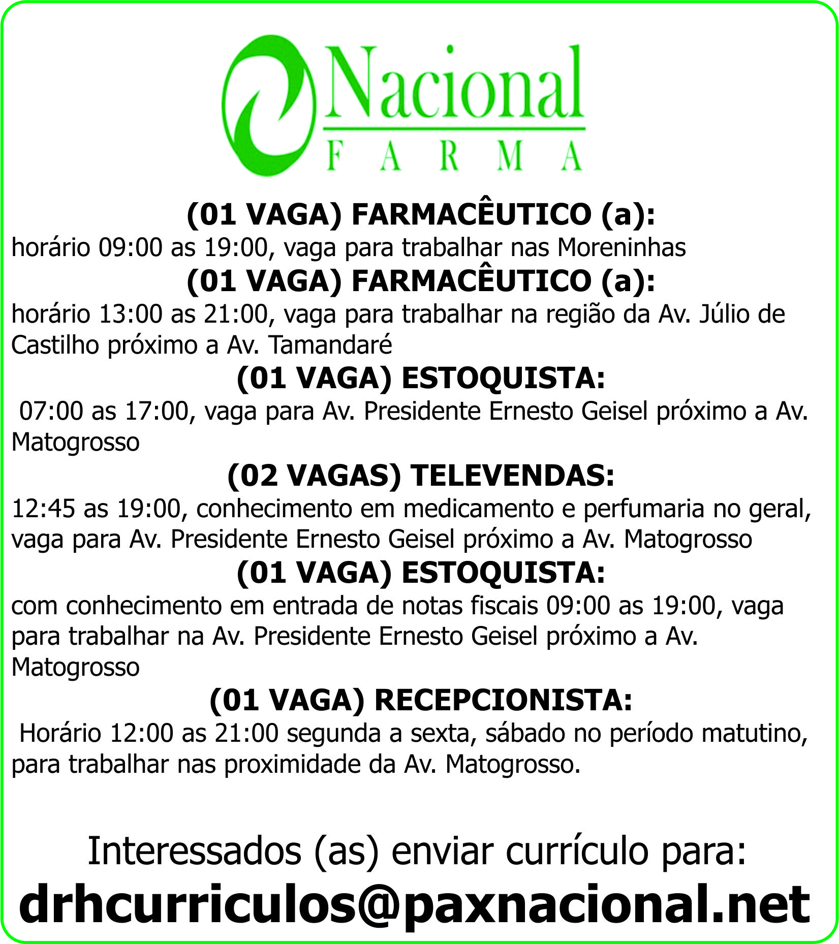 (02 VAGAS) TELEVENDAS: 12:45 as 19:00, conhecimento em medicamento e perfumaria no geral, vaga para Av. Presidente Ernesto Geisel próximo a Av. Matogrosso